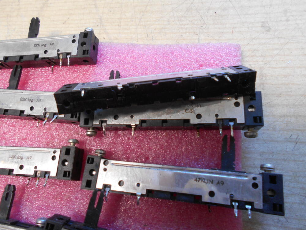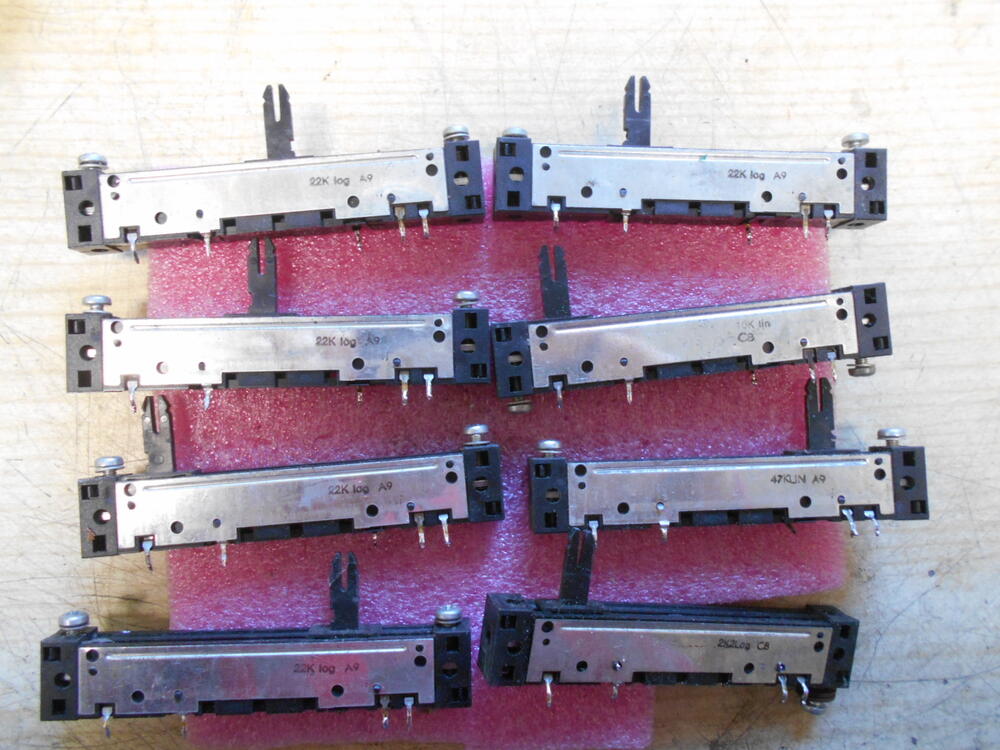 Toló potenciométer monó bontásból 8db egyben. 87x16x10mm Csuszka: 57mm. 22K. log./5db., 10K. lin./1db. 47k. lin./ 1db. 2,2K. log. /1db. Készlet: 1 csomag.